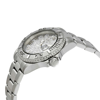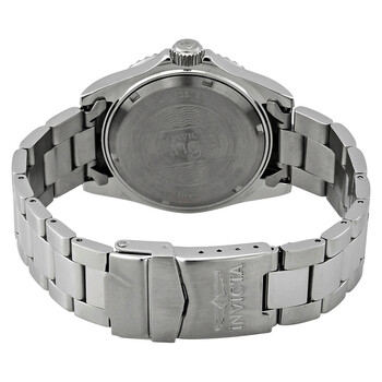 Stainless steel case with a stainless steel bracelet. Uni-directional rotating stainless steel bezel. Silver glitter dial with luminous silver-tone hands and Roman numeral hour markers. Dial Type: Analog. Luminescent hands. Date display at the 3 o'clock position. Ronda caliber 515 quartz movement. Scratch resistant mineral crystal. Screw down crown. Solid case back. Round case shape. Case size: 40 mm. Case thickness: 12 mm. Band width: 20 mm. Band length: 8.25 inches. Fold over clasp. Water resistant at 200 meters / 660 feet. Functions: date, hour, minute, second. Additional Info: in general, suitable for professional marine activity and serious surface water sports, but not diving. Casual watch style. Invicta Angel Silver Glitter Dial Stainless Steel Ladies Watch 22706.