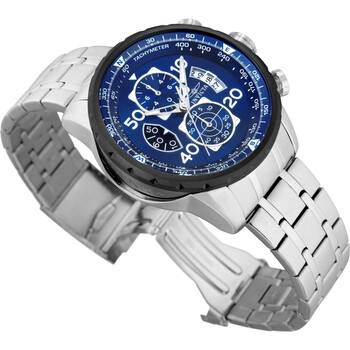 Stainless steel case with a stainless steel bracelet. Fixed gunmetal-plated bezel. Blue dial with luminous silver-tone hands. Tachymeter markings. 360 degree markers around the outer rim. Dial Type: Analog. Luminescent hands and markers. Date display at the 3 o'clock position. Chronograph - three sub-dials displaying: 60 second, 60 minute and 1/10th of a second. Caliber VD57 quartz movement. Scratch resistant flame fusion crystal. Pull / push crown. Solid case back. Case size: 48 mm. Case thickness: 16.5 mm. Round case shape. Band width: 24 mm. Diver safety clasp. Water resistant at 100 meters / 330 feet. Functions: chronograph, date, hour, minute, second, tachymeter, compass. Casual watch style. Watch label: Japan Movt. Invicta Aviator Chronograph Blue Dial Men's Watch 22970.