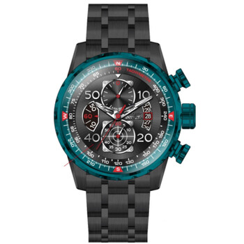 Black stainless steel case and bracelet. Green stainless steel bezel. Black dial with silver-tone hands and Arabic numeral hour markers. Compass markers around the outer rim. Dial Type: Analog. Luminescent hands and markers. Date display at the 3 o'clock position. Chronograph - three sub-dials displaying: 60 second, 60 minute and 1/10th of a second. Hattori Caliber VD57 quartz movement. Scratch resistant Flame Fusion crystal. Pull / push crown. Solid case back. Round case shape, case size: 48 mm, case thickness: 12.5 mm. Band width: 24 mm, band length: 7.25 inches. Fold over safety clasp. Water resistant at 100 meters / 330 feet. Functions: chronograph, date, hour, minute, second. Aviator Series. Sport watch style. Watch label: Japan Movt. Invicta Aviator Chronograph Quartz Black Dial Men's Watch 40701.