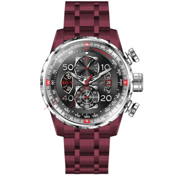 Red stainless steel case and bracelet. Silver-tone stainless steel bezel. Black dial with silver-tone hands and Arabic numeral hour markers. Compass markers around the outer rim. Dial Type: Analog. Luminescent hands and markers. Date display at the 3 o'clock position. Chronograph - three sub-dials displaying: 60 second, 60 minute and 1/10th of a second. Hattori Caliber VD57 quartz movement. Scratch resistant Flame Fusion crystal. Pull / push crown. Solid case back. Round case shape, case size: 48 mm, case thickness: 12.5 mm. Band width: 24 mm, band length: 7.25 inches. Fold over safety clasp. Water resistant at 100 meters / 330 feet. Functions: chronograph, date, hour, minute, second. Aviator Series. Sport watch style. Watch label: Japan Movt. Invicta Aviator Chronograph Quartz Black Dial Men's Watch 40699.