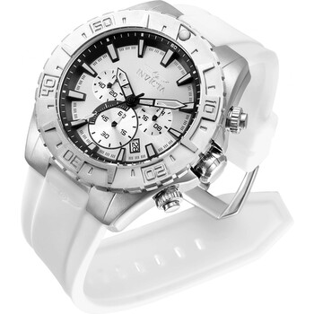Silver-tone stainless steel case with a white silicone strap. Uni-directional rotating silver-tone stainless steel bezel. Silver-tone dial with black hands and index hour markers. Minute markers around the outer rim. Dial Type: Analog. Luminescent hands and markers. Date display between 4 and 5 o'clock position. Chronograph - three sub-dials displaying: 60 second, 60 minute and 24 hour. Hattori Caliber VK63A quartz movement. Scratch resistant Flame Fusion crystal. Pull / push crown. Solid case back. Round case shape, case size: 49 mm, case thickness: 14 mm. Band width: 26 mm, band length: 8.25 inches. Buckle clasp. Water resistant at 100 meters / 330 feet. Functions: chronograph, date, hour, minute, small second. Aviator Series. Sport watch style. Watch label: Japan Movt. Invicta Aviator Chronograph Quartz Silver Dial Men's Watch 37634.