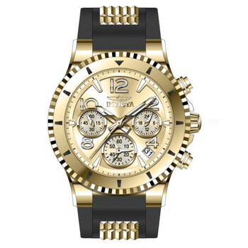 Gold-tone stainless steel case with a black silicone strap with gold-tone inserts. Fixed gold-tone bezel with an inlaid gold aluminum ring. Gold-tone dial with luminous gold-tone hands and alternating index and Arabic numeral hour markers. Minute markers around the outer rim. Dial Type: Analog. Luminescent hands and markers. Date display between the 4 and 5 o'clock positions. Chronograph - three sub-dials displaying: 60 second, 60 minute and 24 hour. Hattori caliber VD53 quartz movement. Scratch resistant Flame Fusion crystal. Pull / push crown. Solid case back. Round case shape. Case size: 39 mm. Case thickness: 11 mm. Band width: 22 mm. Band length: 7.75 inches. Tang clasp. Water resistant at 100 meters / 330 feet. Functions: chronograph, date, GMT, second time zone, hour, minute, second. Blu Series. Casual watch style. Watch label: Japan Movt. Invicta BLU Chronograph Quartz Gold Dial Ladies Watch 36909.