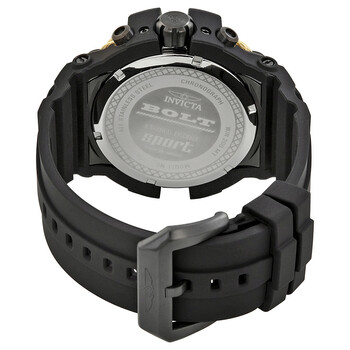 Black ion-plated stainless steel case with a black silicone strap. Fixed black ion-plated with gold-tone wire stainless steel bezel. Black carbon fiber dial with luminous gold-tone hands and index hour markers. Tachymeter markers around the outer rim. Dial Type: Analog. Luminescent hands and markers. Date display between the 4 and 5 o'clock positions. Chronograph - three sub-dials displaying: 60 second, 60 minute and 24 hour. Hattori Caliber VD53 quartz movement. Scratch resistant mineral crystal. Screw down crown. Solid case back. Round case shape. Case size: 48 mm. Band width: 32 mm, band length: 8.25 inches. Tang clasp. Water resistant at 200 meters / 660 feet. Functions: chronograph, tavhymeter, date, hour, minute, second. Additional Info: in general, suitable for professional marine activity and serious surface water sports, but not diving. Casual watch style. Invicta Bolt Chronograph Black Carbon Fiber Dial Men's Watch 23866.