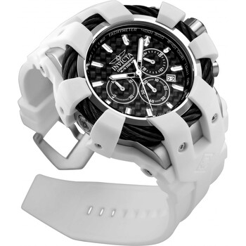 Stainless steel case with a white silicone strap. Fixed stainless steel bezel with black cable wire trim. Black carbon fiber dial with luminous silver-tone hands and index hour markers. Tachymeter markers around the outer rim. Dial Type: Analog. Luminescent hands and markers. Date display between the 4 and 5 o'clock positions. Chronograph - three sub-dials displaying: 60 second, 60 minute and 24 hour. Caliber VD53 quartz movement. Scratch resistant mineral crystal. Screw down crown. Solid case back. Case size: 48 mm. Case thickness: 16.5 mm. Round case shape. Band width: 32 mm. Tang clasp. Water resistant at 200 meters / 660 feet. Functions: chronograph,tachymeter, date, hour, minute, second. Additional Info: in general, suitable for professional marine activity and serious surface water sports, but not diving. Casual watch style. Invicta Bolt Chronograph Black Dial Men's Watch 23856.