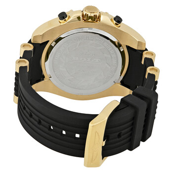 Gold-tone stainless steel case with a two-tone (gold-tone and black) polyurethane, silicone, stainless steel strap. Fixed black and gold-tone stainless steel, cable bezel. Black dial with black hands and index hour markers. Tachymeter scale around the outer rim. Dial Type: Analog. Luminescent hands and markers. Chronograph - three sub-dials displaying: 60 second, 60 minute and 24 hour. Hattori Caliber VD54 quartz movement. Scratch resistant flame fusion crystal. Pull / push crown. Solid case back. Round case shape, case size: 52 mm, case thickness: 18 mm. Band width: 26 mm, band length: 7.8 inches. Buckle clasp. Water resistant at 100 meters / 330 feet. Functions: chronograph, date, hour, minute, second. Sport watch style. Watch label: Japan Movt. Invicta Bolt Chronograph Black Dial Men's Watch 26818.