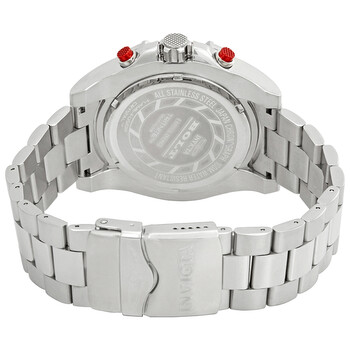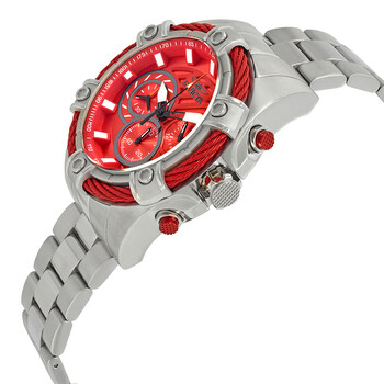 Silver-tone stainless steel case with a silver-tone stainless steel bracelet. Fixed silver-tone/red stainless steel with red cable wire trim bezel. Red dial with luminous hands and index hour markers. Tachymeter markers around the outer rim. Dial Type: Analog. Luminescent hands and markers. Chronograph - three sub-dials displaying: 60 second, 60 minute and 24 hour. Hattori Caliber VD54 quartz movement. Scratch resistant flame fusion crystal. Pull / push crown. Solid case back. Round case shape. Case size: 52 mm. Band width: 26 mm, band length: 7.3 inches. Fold over with safety release clasp. Water resistant at 100 meters / 330 feet. Functions: chronograph, tachymeter, GMT, second time zone, hour, minute, second. Sport watch style. Watch label: Japan Movt. Invicta Bolt Chronograph Red Dial Men's Watch 25514.