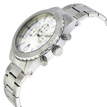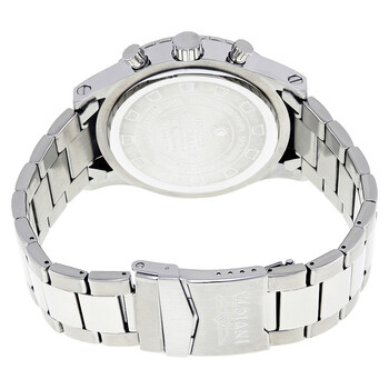 Stainless steel case with a stainless steel bracelet. Unidirectional stainless steel bezel. Silver dial with luminous hands and alternating Arabic numeral and index hour markers. Minute markers around the outer rim. Dial Type: Analog. Luminescent hands and markers. Date display appears at the 6 o'clock position. Chronograph - three sub-dials displaying: 60 second, 60 minute and 24 hour. Quartz movement. Scratch resistant flame fusion crystal. Pull / push crown. Solid case back. Case diameter: 50 mm. Case thickness: 13 mm. Round case shape. Band width: 26 mm. Band length: 9.5 inches. Deployment clasp. Water resistant at 50 meters/ 165 feet. Functions: hours, minutes, seconds, calendar, chronograph, GMT. Sport watch style. Invicta Elegant Ocean Chronograph Men's Watch 1269.
