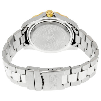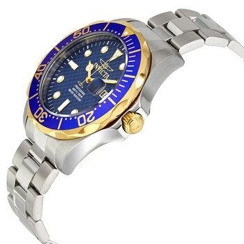 Stainless steel case with a stainless steel bracelet. Uni-directional rotating yellow gold-plated bezel with a blue top ring. Blue carbon fiber dial with luminous yellow gold-tone hands and dot hour markers. Minute markers around the outer rim. Dial Type: Analog. Luminescent hands and markers. Date display at the 3 o'clock position. ISA caliber 2331/103 quartz movement. Scratch resistant flame fusion crystal. Pull / push crown. Solid case back. Round case shape. Case size: 44 mm. Case thickness: 12 mm. Band width: 22 mm. Deployment clasp with a push button release. Water resistant at 200 meters / 660 feet. Functions: date, hour, minute, second. Casual watch style. Invicta Grand Diver Blue Carbon Fiber Dial Men's Watch 12566.