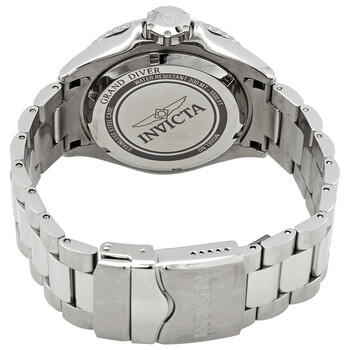 Stainless steel case with a stainless steel bracelet. Uni-directional rotating stainless steel bezel with a blue aluminum ring. Blue dial with luminous silver-tone hands and dot hour markers. Minute markers around the outer rim. Dial Type: Analog. Luminescent hands and markers. Date display at the 3 o'clock position. Hattori Caliber PC32 quartz movement. Scratch resistant mineral crystal. Screw down crown. Solid case back. Round case shape. Case size: 50 mm. Case thickness: 14 mm. Band width: 24 mm. Band length: 8.25 inches. Fold over clasp. Water resistant at 300 meters / 1000 feet. Functions: date, hour, minute, second. Pro Diver Series. Dive watch style. Watch label: Japan Movt. Invicta Pro Diver Quartz Blue Dial Stainless Steel Men's Watch 28766.