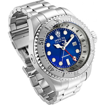 Stainless steel case with a stainless steel bracelet. Uni-directional rotating stainless steel bezel. Blue dial with luminous silver-tone Breguet-style hands and dot hour markers. Minute markers. 24 hour (GMT) around the outer rim. Dial Type: Analog. Luminescent hands and markers. Date display at the 3 o'clock position. Ronda caliber 515.24H quartz movement. Scratch resistant flame fusion crystal. Screw down crown. Solid case back. Round case shape. Case size: 52 mm. Case thickness: 23.6 mm. Band width: 24 mm, band length: 8.25 inches. Fold over clasp. Water resistant at 1000 meters / 3300 feet. Functions: date, GMT, second time zone, hour, minute, second. Dive watch style. Watch label: Swiss Movt. Invicta Hydromax Quartz Blue Dial Men's Watch 29727.