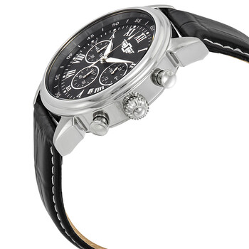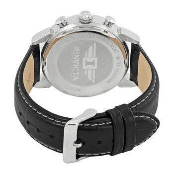 Stainless steel case with a black leather strap. Fixed stainless steel bezel. Black dial with luminous silver-tone alpha-style hands and Roman numeral hour markers. Minute markers. Arabic numeral minute markers (at 5 minute intervals) around the outer rim. Dial Type: Analog. Luminescent hands and markers. Date display between the 4 and 5 o'clock positions. Chronograph - three sub-dials displaying: 60 second, 60 minute and 24 hour. Hattori caliber VD53 quartz movement. Scratch resistant mineral crystal. Pull / push crown. Solid case back. Round case shape. Case size: 44 mm. Case thickness: 12.5 mm. Band width: 22 mm. Tang clasp. Water resistant at 50 meters / 165 feet. Functions: chronograph, date, GMT, second time zone, hour, minute, second. I By Invicta Series. Sport watch style. Watch label: Japan Movt. Invicta I by Invicta Chronograph Black Dial Men's Watch IBI-90242-001.
