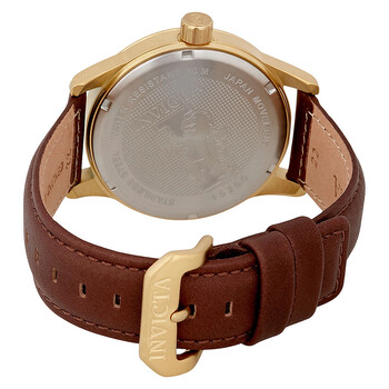 18kt gold-plated stainless steel case with a brown (calfskin) leather strap. Fixed 18kt gold-plated bezel. Blue dial with luminous gold-tone hands and Arabic numeral hour markers. Arabic numeral minute markers (at 5 minute intervals). Minute markers around the outer rim. Dial Type: Analog. Luminescent hands and markers. Date display at the 3 o'clock position. Caliber: 2415 quartz movement. Scratch resistant mineral crystal. Pull / push crown. Solid case back. Case size: 45 mm. Case thickness: 10 mm. Round case shape. Band width: 22 mm. Band length: 9 inches. Tang clasp. Water resistant at 50 meters / 165 feet. Functions: date, hour, minute, second. Casual watch style. Invicta I-Force Blue Dial Men's Watch 15255.