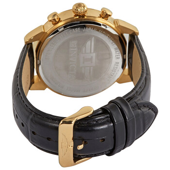 Yellow gold-tone stainless steel case with a black leather strap. Fixed yellow gold-tone bezel. Black dial with luminous yellow gold-tone alpha-style hands and Roman numeral hour markers. Minute markers. Arabic numeral minute markers (at 5 minute intervals) around the outer rim. Dial Type: Analog. Luminescent hands and markers. Date display between the 4 and 5 o'clock positions. Chronograph - three sub-dials displaying: 60 second, 60 minute and 24 hour. Hattori caliber VD53 quartz movement. Scratch resistant mineral crystal. Pull / push crown. Solid case back. Round case shape. Case size: 44 mm. Case thickness: 13 mm. Band width: 22 mm. Tang clasp. Water resistant at 50 meters / 165 feet. Functions: chronograph, date, GMT, second time zone, hour, minute, second. Invicta I Series. Sport watch style. Watch label: Japan Movt. Invicta Invicta I Chronograph Black Dial Men's Watch IBI-90242-003.