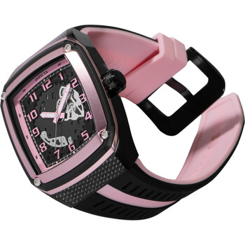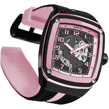 Black stainless steel case with a two-tone (pink and black) silicone strap. Fixed two-tone (pink and black) plastic and aluminum and stainless steel bezel. Gunmetal and pink dial with pink hands and Arabic numeral hour markers. Minute markers around the outer rim. Dial Type: Analog. Luminescent hands and markers. Date display at the 6 o'clock position. Caliber VJ42 quartz movement. Scratch resistant mineral crystal. Pull / push crown. Transparent see through case back. Tonneau case shape, case size: 45.5 mm, case thickness: 13.50 mm. Band width: 30 mm, band length: 9 inches. Buckle clasp. Water resistant at 50 meters / 165 feet. Functions: date, hour, minute, second. Invicta Racing Series. Casual watch style. Invicta Invicta Racing JM Limited Edition Quartz Men's Watch 48068.