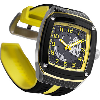 Silver-tone and black stainless steel case with a two-tone (yellow and black) silicone strap. Fixed two-tone (yellow and black) plastic and aluminum and stainless steel bezel. Gunmetal and yellow dial with gold-tone hands and Arabic numeral hour markers. Dial Type: Analog. Luminescent hands and markers. Caliber VJ42 quartz movement. Scratch resistant mineral crystal. Pull / push crown. Transparent see through case back. Tonneau case shape, case size: 45.5 mm, case thickness: 13.50 mm. Band width: 30 mm, band length: 9 inches. Buckle clasp. Water resistant at 50 meters / 165 feet. Functions: hour, minute. Invicta Racing Series. Casual watch style. Invicta Invicta Racing JM Limited Edition Quartz Men's Watch 48070.