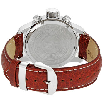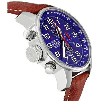 Stainless steel case with a brown leather strap with contrast stiching. Fixed stainless steel bezel. Blue dial with luminous hands and Arabic numeral hour markers. Minute markers. Tachymeter markers around the outer rim. Luminescent hands and markers. Date display at the 4 o'clock position. Chronograph - three sub-dials displaying: 60 seconds, 60 minutes and 12 hours. Quartz movement. Scratch resistant mineral crystal. Left-handed crown. Solid case back. Case diameter: 46 mm. Case thickness: 12 mm. Tang clasp. Water resistant at 100 meters / 330 feet. Functions: hours, minutes, seconds, date, chronograph, tachymeter. Invicta Lefty Chronograph Blue Dial Stainless Steel Brown Leather Band Unisex Watch 3328.