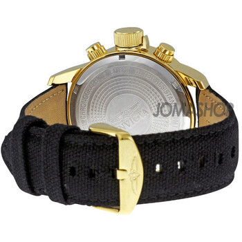 Gold-tone stainless steel case with a black canvas (leather backed) strap. Fixed gold-tone bezel. Blue dial with luminous silver-tone hands and Arabic numeral hour markers. Minute markers. Tachymeter around the outer rim. Dial Type: Analog. Luminescent hands and markers. Date display at 4 o'clock position. Chronograph - three sub-dials displaying: 60 minutes, 60 seconds and 1/10 seconds. Quartz movement. Scratch resistant flame fusion crystal. Screw down crown. Solid case back. Case diameter: 46mm. Case thickness: 12mm. Band width: 21 mm. Tang clasp. Water resistant at 100 meters / 330 feet. Functions: chronograph, date, tachymeter, hour, minute, second. Casual watch style. Invicta Lefty Force Chronograph Men's Watch 1516.