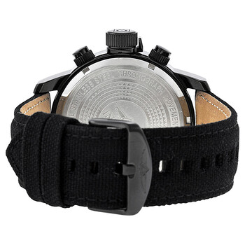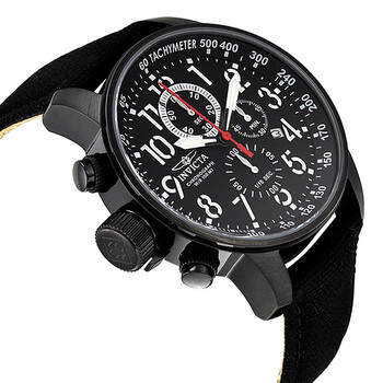 Black ion-plated stainless steel case with a black canvas / leather-backed strap Fixed black ion-plated bezel. Black dial with silver-tone hands and Arabic numeral hour markers. Minute markers. Tachymeter around the outer rim. Dial Type: analog. Luminescent hands and hour markers. Date display at 4 o'clock position. Chronograph - three sub-dials displaying: 60 minute, 60 second, 1/10 of a seconds. Quartz movement. Scratch resistant flame fusion crystal. Screw down crown. Solid case back. Case diameter: 46 mm. Case thickness: 12 mm. Band width: 22 mm. Tang clasp. Water resistant at 100 meters / 330 feet. Functions: chronograph, date, tachymeter, hour, minute, second. Casual watch style. Invicta Lefty Force Chronograph Men's Watch 1517.