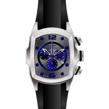 Silver-tone stainless steel case with a black silicone strap. Fixed silver-tone stainless steel bezel. Grey dial with blue hands and index-Arabic numeral hour markers. Minute markers around the outer rim. Dial Type: Analog. Luminescent hands. Date display at the 4 o'clock position. Chronograph - three sub-dials displaying: 60 second, 30 minute and 12 hour. Ronda Caliber 5030.D quartz movement. Scratch resistant Flame Fusion crystal. Pull / push crown. Solid case back. Tonneau case shape, case size: 47 mm, case thickness: 12.5 mm. Band width: 30 mm, band length: 9 inches. Buckle clasp. Water resistant at 50 meters / 165 feet. Functions: chronograph, date, hour, minute, small second. Lupah Series. Casual watch style. Watch label: Swiss Movt. Invicta Lupah Chronograph Quartz Grey Dial Men's Watch 43637.