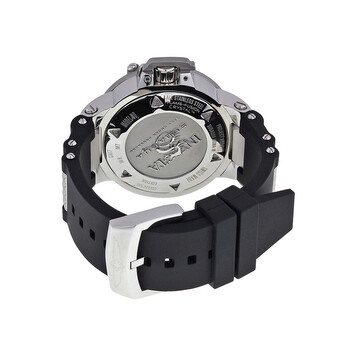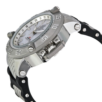 Silver-tone stainless steel case with a two-tone (black and silver-tone) black polyurethane with stainless steel accents strap. Uni-directional rotating silver-tone stainless steel bezel. Mother of pearl dial with silver tone sword-shaped hands and Arabic hour markers. Minute markers. GMTmarkings around the outer rim. Dial Type: Analog. Luminescent hands and markers. Date display at the 3 o'clock position. Ronda Caliber 515.24H quartz movement. Scratch resistant flame fusion crystal. Screw down crown. Solid case back. Round case shape, case size: 50 mm, case thickness: 18 mm. Band length: 9.25 inches. Deployment clasp. Water resistant at 500 meters / 1650 feet. Functions: date, hour, minute, second. Additional Info: GMT hand shows time in another time zone. Sport watch style. Watch label: Swiss Made. Invicta Men's Black Subaqua III Limited Edition Watch 0737.