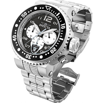 Black and steel stainless steel case with a silver-tone stainless steel bracelet. Uni-directional rotating black and steel stainless steel and aluminum bezel. Black and white dial with silver-tone hands and Arabic numeral hour markers. Minute markers around the outer rim. Dial Type: Analog. Luminescent hands and markers. Date display between 4 and 5 o'clock position. Chronograph - three sub-dials displaying: 60 second, 60 minute and 24 hour. Hattori Caliber VD53 quartz movement. Scratch resistant mineral crystal. Screw down crown. Solid case back. Round case shape, case size: 52 mm, case thickness: 20 mm. Band width: 29.8 mm, band length: 8.25 inches. Fold over clasp. Water resistant at 200 meters / 660 feet. Functions: chronograph, date, GMT, second time zone, hour, minute, second. Sport watch style. Watch label: Japan Movt. Invicta NFL Oakland Raiders Chronograph Quartz Men's Watch 30279.