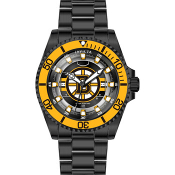 Black stainless steel case and bracelet. Yellow and white and black stainless steel bezel. Yellow and white and black dial with black hands and index hour markers. Minute markers around the outer rim. Dial Type: Analog. Luminescent hands and markers. Hattori Caliber PC21 quartz movement. Scratch resistant Flame Fusion crystal. Pull / push crown. Solid case back. Round case shape, case size: 38 mm. Band width: 20 mm, band length: 7 inches. Fold over clasp. Water resistant at 100 meters / 330 feet. Functions: hour, minute, second. Nhl Series. Casual watch style. Watch label: Japan Movt. Invicta NHL Boston Bruins Quartz Ladies Watch 42207.