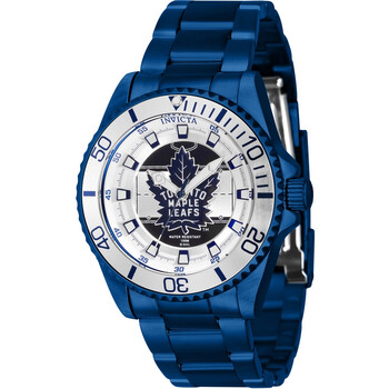 Blue stainless steel case and bracelet. White and silver and blue stainless steel bezel. Blue dial with silver-tone hands and index hour markers. Minute markers around the outer rim. Dial Type: Analog. Luminescent hands and markers. Hattori Caliber PC21 quartz movement. Scratch resistant Flame Fusion crystal. Pull / push crown. Solid case back. Round case shape, case size: 38 mm. Band width: 20 mm, band length: 7 inches. Fold over clasp. Water resistant at 100 meters / 330 feet. Functions: hour, minute, second. Nhl Series. Casual watch style. Watch label: Japan Movt. Invicta NHL Toronto Maple Leafs Quartz Blue Dial Ladies Watch 42210.