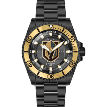 Black stainless steel case and bracelet. White and gold and black stainless steel bezel. Black dial with gold-tone hands and index hour markers. Minute markers around the outer rim. Dial Type: Analog. Luminescent hands and markers. Hattori Caliber PC21 quartz movement. Scratch resistant Flame Fusion crystal. Pull / push crown. Solid case back. Round case shape, case size: 38 mm. Band width: 20 mm, band length: 7 inches. Fold over clasp. Water resistant at 100 meters / 330 feet. Functions: hour, minute, second. Nhl Series. Casual watch style. Watch label: Japan Movt. Invicta NHL Vegas Golden Knights Quartz Black Dial Ladies Watch 42209.