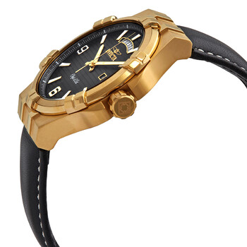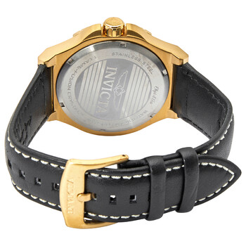 Yellow gold-tone stainless steel case with a black leather strap. Fixed yellow gold-tone bezel. Black dial with luminous yellow gold-tone hands and index hour markers. Arabic numerals mark the 3, 6 and 9 o'clock positions. Minute markers around the outer rim. Dial Type: Analog. Luminescent hands and markers. Date display at the 3 o'clock position. Day of the week display centered on the 12 o'clock position. SII caliber VJ55B quartz movement. Scratch resistant flame fusion crystal. Pull / push crown. Solid case back. Round case shape. Case size: 44 mm. Case thickness: 10.5 mm. Band width: 24 mm. Band length: 8.75 inches. Tang clasp. Water resistant at 100 meters / 330 feet. Functions: date, day, hour, minute, second. Casual watch style. Watch label: Japan Movt. Invicta Objet D Art Quartz Black Dial Black Leather Men's Watch 30186.