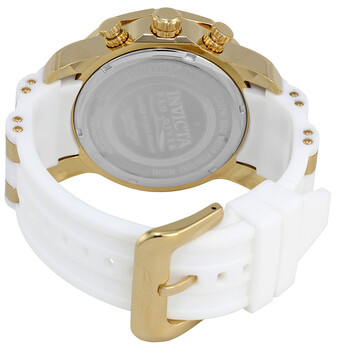 Gold-plated stainless steel case with a white silicone strap with gold-plated accents. Uni-directional rotating gold-plated bezel. Green dial with luminous gold-tone hands and index hour markers. Minute markers. Tachymeter markings around the outer rim. Dial Type: Analog. Luminescent hands and markers. Date display between the 4 and 5 o'clock positions. Chronograph - three sub-dials displaying: 60 second, 30 minute and 24 hour. Caliber: VD53 quartz movement. Scratch resistant flame fusion crystal. Pull / push crown. Solid case back. Case size: 50 mm. Case thickness: 17 mm. Dodecagon case shape. Band width: 26 mm. Band length: 7.8 inches. Fold over clasp with a safety release. Water resistant at 100 meters / 330 feet. Functions: chronograph, tachymeter, date, hour, minute, second. Casual watch style. Invicta Pro Dive Chronograph Green Dial Men's Watch 23422.