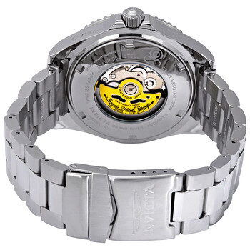 Stainless steel case with a stainless steel bracelet. Uni-directional rotating stainless steel bezel with a black ion-plated ring. Black dial with silver-tone hands and dot hour markers. Minute markers around the outer rim. Dial Type: Analog. Luminescent hands and markers. Date display at the 3 o'clock position. Automatic movement. Scratch resistant mineral crystal. Screw down crown. Transparent case back. Round case shape. Case size: 47 mm. Case thickness: 16 mm. Band width: 22 mm. Deployment clasp with a push button release. Water resistant at 300 meters / 1000 feet. Functions: date, hour, minute, second. Additional Info: suitable for professional marine activity serious surface water sports and skin diving. Dive watch style. Invicta Pro Diver Automatic Black Dial Men's Watch 27610.