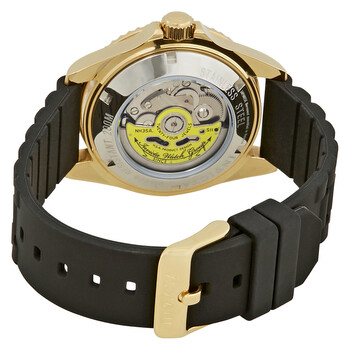 Yellow gold-plated stainless steel case with a black silicone strap. Uni-directional rotating yellow gold-plated bezel with a black top ring. Black dial with luminous yellow gold-tone hands and dot hour markers. Minute markers around the outer rim. Dial Type: Analog. Luminescent hands and markers. Date display at the o'clock position. SII caliber NH35A automatic movement with a 41-hour power reserve. Scratch resistant mineral crystal. Screw down crown. Transparent case back. Round case shape. Case size: 40 mm. Case thickness: 13 mm. Band width: 20 mm, band length: 8.5 inches. Buckle clasp. Water resistant at 200 meters / 660 feet. Functions: date, hour, minute, second. Sport watch style. Invicta Pro Diver Automatic Black Dial Men's Watch 23681.