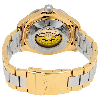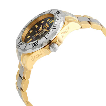 Gold-plated stainless steel case with a two-tone (silver-tone and gold-plated) stainless steel bracelet. Uni-directional rotating stainless steel bezel with a silver-tone (count-up elapsed time) top ring. Black mother of pearl dial with luminous gold-tone arrow-shaped hands and dot hour markers. Minute markers around the outer rim. Dial Type: Analog. Luminescent hands and markers. Date display at the 3 o'clock position. SII caliber NH35A automatic movement, containing 24 Jewels, bitting at 21600 vph, and has a power reserve of approximately 41 hours. Scratch resistant flame fusion crystal. Screw down crown. Transparent case back. Round case shape. Case size: 47 mm. Case thickness: 17 mm. Band width: 22 mm. Band length: 8.25 inches. Fold over clasp with a safety release. Water resistant at 300 meters / 1000 feet. Functions: date, hour, minute, second. Additional Info: in general, suitable for professional marine activity and serious surface water sports, but not diving. Pro Diver Series. Dive watch style. Watch label: Japan Movt. Invicta Pro Diver Automatic Black Mother of Pearl Men's Watch 16034.