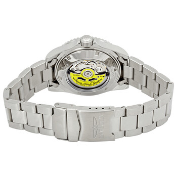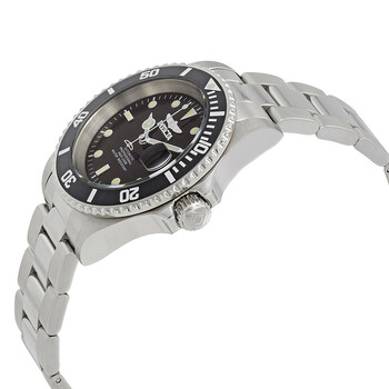Stainless steel case with a silver-tone stainless steel bracelet. Uni-directional rotating black sunray stainless steel with a black top ring bezel. Black sunray dial with luminous silver-toneBreguet-style shape hands and dot hour markers. Minute markers around the outer rim. Dial Type: Analog. Luminescent hands and markers. Date display at the 3 o'clock position. SII Caliber NH35A Automatic movement, containing 24 Jewels, bitting at 21600 vph, and has a power reserve of approximately 41 hours. Scratch resistant mineral crystal. Screw down crown. Transparent case back. Round case shape, case size: 40 mm, case thickness: 14 mm. Band width: 20 mm, band length: 8.25 inches. Deployment with push button release clasp. Water resistant at 200 meters / 660 feet. Functions: date, hour, minute, second. Pro Diver Series. Casual watch style. Watch label: Japan Movt. Invicta Pro Diver Automatic Black Sunray Dial Stainless Steel Men's Watch 24760.