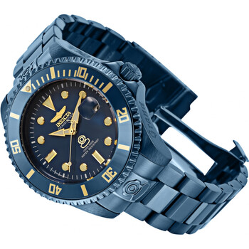Blue stainless steel case and bracelet. Uni-directional rotating blue stainless steel bezel. Blue dial with gold-tone hands and dots hour markers. Minute markers around the outer rim. Dial Type: Analog. Luminescent hands and markers. Date display at the 3 o'clock position. SII Caliber NH35A Automatic movement, containing 24 Jewels, bitting at 21600 vph, and has a power reserve of approximately 41 hours. Scratch resistant mineral crystal. Screw down crown. Transparent see through case back. Round case shape, case size: 47 mm, case thickness: 16 mm. Band width: 22 mm, band length: 8 inches. Fold over clasp. Water resistant at 300 meters / 1000 feet. Functions: date, hour, minute, second. Pro Diver Series. Dive watch style. Watch label: Japan Movt. Invicta Pro Diver Automatic Blue Dial Men's Watch 33387.