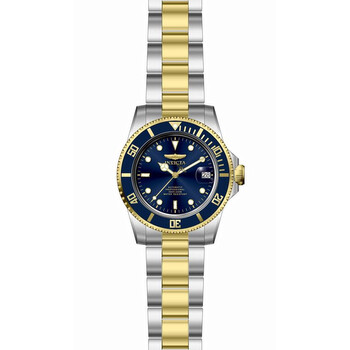 Stainless steel case with a two-tone (silver-tone and gold-tone) stainless steel bracelet. Uni-directional rotating gold-tone bezel with an inlaid navy blue ring. Navy blue dial with luminous gold-tone hands and dot hour markers. Minute markers around the outer rim. Dial Type: Analog. Luminescent hands and markers. Date display at the 3 o'clock position. SII caliber NH35A automatic movement, containing 24 Jewels, bitting at 21600 vph, and has a power reserve of approximately 41 hours. Scratch resistant mineral crystal. Screw down crown. Transparent case back. Round case shape. Case size: 40 mm. Case thickness: 14.5 mm. Band width: 20 mm. Band length: 8 inches. Fold over clasp. Water resistant at 200 meters / 660 feet. Functions: date, hour, minute, second. Pro Diver Series. Casual watch style. Watch label: Japan Movt. Invicta Pro Diver Automatic Blue Dial Men's Watch 35703.