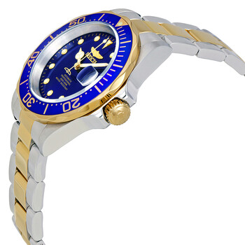 Stainless steel case with a two-tone (silver-tone and yellow gold ion-plated) stainless steel bracelet. Uni-directional rotating yellow gold ion-plated bezel with a blue ring. Blue dial with luminous yellow gold-tone hands and dot hour markers. Minute markers around the outer rim. Dial Type: Analog. Luminescent hands and markers. Date display at the 3 o'clock position. SII caliber NH35A automatic movement, containing 24 Jewels, bitting at 21600 vph, and has a power reserve of approximately 41 hours. Scratch resistant mineral crystal. Screw down crown. Transparent case back. Round case shape. Case size: 40 mm. Case thickness: 14 mm. Band width: 20 mm. Band length: 8.25 inches. Fold over clasp with a safety release. Water resistant at 200 meters / 660 feet. Functions: date, hour, minute, second. Pro Diver Series. Dress watch style. Watch label: Japan Movt. Invicta Pro Diver Automatic Blue Dial Two-tone Men's Watch 17042.
