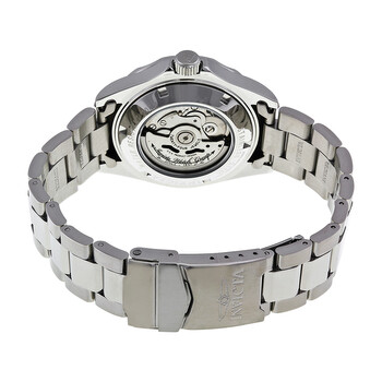 Stainless steel case with a stainless steel bracelet. Uni-directional rotating stainless steel bezel with a black and red (Coke) ion-plated ring. Black dial with luminous hands and dot hour markers. Minute markers around the outer rim. Dial Type: Analog. Luminescent hands and markers. Date display at the 3 o'clock position. SII caliber NH35A automatic movement, containing 24 Jewels, bitting at 21600 vph, and has a power reserve of approximately 41 hours. Scratch resistant mineral crystal. Screw down crown. Skeleton case back. Round case shape. Case size: 40 mm. Case thickness: 14 mm. Band width: 20 mm. Band length: 9 inches. Fold over clasp with a safety release. Water resistant at 200 meters / 660 feet. Functions: date, hour, minute, second. Pro Diver Series. Sport watch style. Watch label: Japan Movt. Invicta Pro Diver Automatic Coke Bezel Men's Watch 9403.