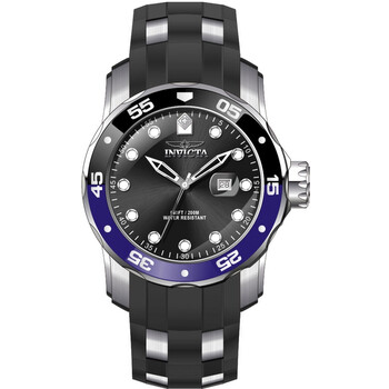 Silver-tone stainless steel case with a two-tone (black and silver-tone) silicone strap. Uni-directional rotating black and blue (Batman) stainless steel bezel. Black dial with silver-tone hands and index hour markers. Dial Type: Analog. Luminescent hands and markers. Date display at the 3 o'clock position. Hattori Caliber PC32 quartz movement. Scratch resistant Flame Fusion crystal. Pull / push crown. Solid case back. Round case shape, case size: 48 mm, case thickness: 16.7 mm. Band width: 26 mm, band length: 8.25 inches. Buckle clasp. Water resistant at 100 meters / 330 feet. Functions: date, hour, minute, second. Pro Diver Series. Casual watch style. Watch label: Japan Movt. Invicta Pro Diver Black Dial Batman Bezel Men's Watch 39106.