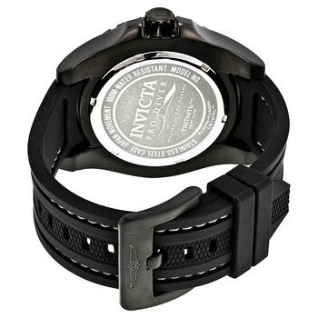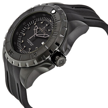 Black ion-plated stainless steel case with a black polyurethane strap. Uni-directional rotating black ion-plated bezel. Black dial with luminous black hands and index hour markers. Minute markers. Arabic numeral minute markers (at 5 minute intervals) around the outer rim. Dial Type: Analog. Luminescent hands and markers. Date display at the 3 o'clock position. Hattori caliber PC32 quartz movement. Scratch resistant Flame Fusion crystal. Pull / push crown. Solid case back. Round case shape. Case size: 52 mm. Case thickness: 16 mm. Band width: 26 mm. Band length: 8 inches. Tang clasp. Water resistant at 100 meters / 330 feet. Functions: date, hour, minute, second. Pro Diver Series. Casual watch style. Watch label: Japan Movt. Invicta Pro Diver Black Dial Men's Watch 23734.