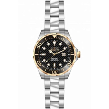 Stainless steel case with a stainless steel bracelet. Uni-directional rotating rose gold ion-plated bezel with an inlaid black top ring. Black dial with luminous rose gold-tone hands and dot hour markers. Minute markers around the outer rim. Dial Type: Analog. Luminescent hands and markers. Date display appears at the 3 o'clock position. Swiss quartz movement. Scratch resistant mineral crystal. Pull / push crown. Solid case back. Case diameter: 47 mm. Case thickness: 12 mm. Round case shape. Band width: 20 mm. Fold over with safety release clasp. Water resistant at 200 meters / 660 feet. Functions: date, hour, minute, second. Casual watch style. Invicta Pro Diver Black Dial Stainless Steel Men's Watch 12567.