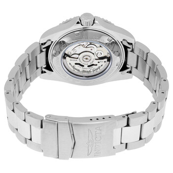 Stainless steel case with a stainless steel bracelet. Uni-directional rotating coin edge stainless steel bezel with a blue (count-up elapsed time) top ring. Blue dial with luminous silver-tone Breguet-style shape hands and dot hour markers. Minute markers around the outer rim. Dial Type: Analog. Luminescent tritnite hands and markers. Date display at the 3 o'clock position. SII caliber NH35A automatic movement, containing 24 Jewels, bitting at 21600 vph, and has a power reserve of approximately 41 hours. Scratch resistant mineral crystal. Screw down crown. Transparent case back. Round case shape. Case size: 40 mm. Case thickness: 13.5 mm. Band width: 20 mm. Band length: 8.25 inches. Fold over clasp with a safety release. Water resistant at 200 meters / 660 feet. Functions: date, hour, minute, second. Pro Diver Series. Casual watch style. Watch label: Japan Movt. Invicta Pro Diver Blue Dial Stainless Steel Men's Watch 9094OB.
