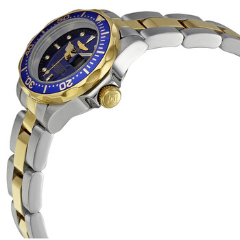 Stainless steel case with a two-tone (silver-tone and yellow gold-plated) stainless steel bracelet. Fixed yellow gold-plated bezel with a blue ion-plated top ring. Blue dial with luminousd yellow gold-tone hands and dot hour markers. Minute markers around the outer rim. Dial Type: Analog. Luminescent hands and markers. Date display at the 3 o'clock position. TMI caliber PC22A quartz movement. Scratch resistant anti-reflective sapphire crystal. Screw down crown. Solid case back. Round case shape. Case size: 24.5 mm. Case thickness: 10 mm. Band width: 12 mm. Band length: 8 inches. Divers clasp. Water resistant at 100 meters / 330 feet. Functions: hours, minutes, seconds, date. Pro Diver Series. Casual watch style. Watch label: Japan Movt. Invicta Pro Diver Blue Dial Two-tone Ladies Watch 8942.