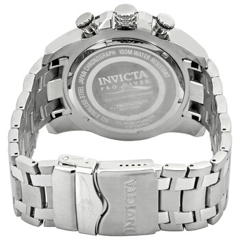 Stainless steel case with a stainless steel bracelet. Fixed stainless steel bezel. Black bezel ring. Black dial with luminous silver-tone hands and index hour markers. Arabic numeral minute markers (at 5 minute intervals) around an inner ring. Minute markers around the outer rim. Dial Type: Analog. Luminescent hands and markers. Date display between the 4 and 5 o'clock positions. Chronograph - three sub-dials displaying: 60 second, 30 minute and 1/10th of a second. ISA caliber 6371D quartz movement. Scratch resistant Flame Fusion crystal. Pull / push crown. Solid case back. Round case shape. Case size: 50 mm. Case thickness: 14.5 mm. Band width: 26 mm. Band length: 7.65 inches. Fold over clasp with a safety release. Water resistant at 100 meters / 330 feet. Functions: chronograph, date, hour, minute, second. Additional Info: suitable for snorkeling as well as swimming but not diving. Pro Diver Series. Casual watch style. Invicta Pro Diver Chronograph Black Dial Men's Watch 22318.