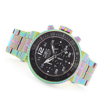 Silver-tone transluscent rainbow stainless steel case with a silver-tone transluscent rainbow stainless steel bracelet. Uni-directional rotating black aluminum bezel. Black dial with silver-tone hands and Arabic numeral and index hour markers. Minute markers around the outer rim. Dial Type: Analog. Luminescent hands and markers. Date display between 4 and 5 o'clock position. Chronograph - three sub-dials displaying: 60 second, 60 minute and 24 hour. Hattori Caliber VD53 quartz movement. Scratch resistant mineral crystal. Screw down crown. Solid case back. Round case shape. Case size: 52 mm. Band width: 29 mm. Fold over clasp. Water resistant at 500 meters / 1650 feet. Functions: chronograph, date, GMT, second time zone, hour, minute, second. Dive watch style. Watch label: Japan Movt. Invicta Pro Diver Chronograph Black Dial Men's Watch 25078.