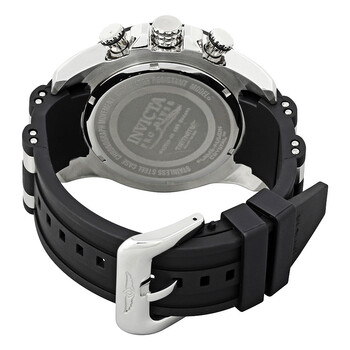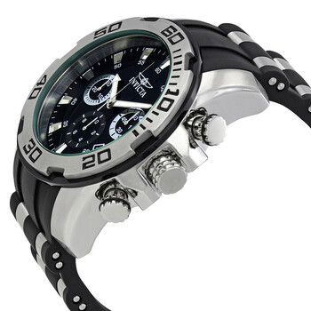Stainless steel case with a black polyurethane strap with stainless steel barrel inserts. Uni-directional rotating stainless steel bezel with a black aluminium outer rim. Black dial with luminous silver-tone arrow-shaped hands and index hour markers. Minute markers around the outer rim. Dial Type: Analog. Luminescent hands and markers. Date display between the 4 and 5 o'clock positions. Chronograph - three sub-dials displaying: 60 second, 30 minute and 1/10th of a second. ISA caliber 6371D quartz movement. Scratch resistant flame fusion crystal. Pull / push crown. Solid case back. Round case shape. Case size: 50 mm. Case thickness: 14.5 mm. Band width: 26 mm. Band length: 8.25 inches. Tang clasp. Water resistant at 100 meters / 330 feet. Functions: chronograph, date, hour, minute, second. Casual watch style. Invicta Pro Diver Chronograph Black Dial Men's Watch 22311.