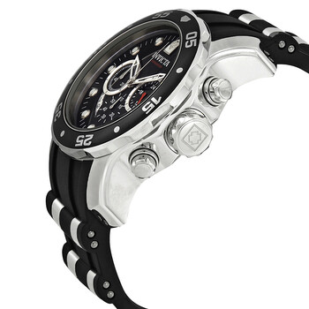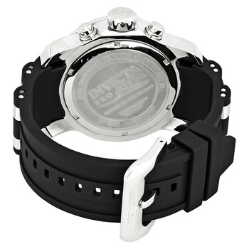 Stainless steel case with a black polyurethane strap with stainless steel inserts. Uni-directional rotating stainless steel bezel with an inlaid black ring. Black dial with silver-tone skeleton sword-shaped hands and dot hour markers. Minute markers around the outer rim. Dial Type: Analog. Luminescent hands and markers. Date display between the 4 and 5 o'clock positions. Chronograph - three sub-dials displaying: 60 second, 30 minute and 1/10th of a second. ISA caliber 6371D quartz movement. Scratch resistant flame fusion crystal. Pull / push crown. Solid case back. Round case shape. Case size: 48 mm. Case thickness: 17 mm. Band width: 26 mm. Band length: 8.25 inches. Fold over clasp. Water resistant at 100 meters / 330 feet. Functions: chronograph, date, hour, minute, second. Additional Info: suitable for snorkeling as well as swimming but not diving. Casual watch style. Invicta Pro Diver Chronograph Black Dial Men's Watch 21927.