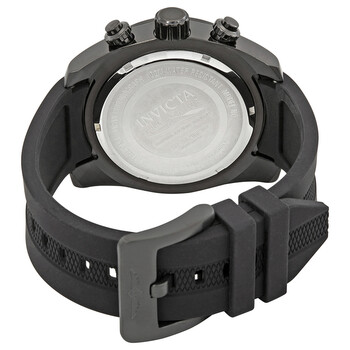 Black ion-plated stainless steel case with a black silicone strap. Fixed black ion-plated bezel. Black dial with luminous silver-tone hands and index hour markers. Arabic numerals mark the 6 and 12 o'clock positions. Minute markers around the outer rim. Dial Type: Analog. Luminescent hands and markers. Date display at the 4 o'clock position. Chronograph - three sub-dials displaying: 60 second, 60 minute and 1/10th of a second. Hattori caliber VD57 quartz movement. Scratch resistant flame fusion crystal. Screw down crown. Solid case back. Round case shape. Case size: 50 mm. Case thickness: 14.5 mm. Band width: 26 mm. Tang clasp. Water resistant at 100 meters / 330 feet. Functions: chronograph, date, hour, minute, second. Additional Info: in general, suitable for swimming and snorkeling, but not diving. Sport watch style. Invicta Pro Diver Chronograph Black Dial Men's Watch 24163.