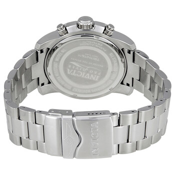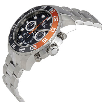 Stainless steel case with a stainless steel bracelet. Uni-directional rotating stainless steel bezel with a grey and orange top ring. Charcoal dial with luminous silver-tone hands and dot hour markers. Minute markers around the outer rim. Dial Type: Analog. Luminescent hands and markers. Date display at the 6 o'clock position. Chronograph - three sub-dials displaying: 60 second, 30 minute and 1/10th of a second. Quartz movement. Scratch resistant flame fusion crystal. Pull / push crown. Solid case back. Case size: 50 mm. Case thickness: 13 mm. Round case shape. Band width: 26 mm. Fold over clasp with a safety release. Water resistant at 100 meters / 330 feet. Functions: chronograph, date, hour, minute, second. Casual watch style. Invicta Pro Diver Chronograph Charcoal Dial Men's Watch 22230.