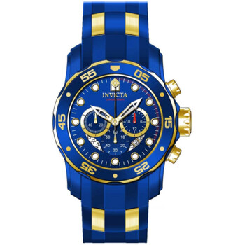 Blue stainless steel case with a two-tone (blue and gold) silicone and stainless steel strap. Two-tone (gold and blue) aluminum and stainless steel bezel. Blue dial with silver-tone hands and index hour markers. Minute markers around the outer rim. Dial Type: Analog. Date display between 4 and 5 o'clock position. Chronograph - three sub-dials displaying: 60 second, 60 minute and 24 hour. Hattori Caliber VD53 quartz movement. Scratch resistant Flame Fusion crystal. Pull / push crown. Solid case back. Round case shape, case size: 48 mm, case thickness: 12 mm. Band width: 26 mm, band length: 8.25 inches. Buckle clasp. Water resistant at 100 meters / 330 feet. Functions: chronograph, date, GMT, second time zone, hour, minute, second. Pro Diver Series. Sport watch style. Watch label: Japan Movt. Invicta Pro Diver Chronograph Quartz Blue Dial Men's Watch 40934.